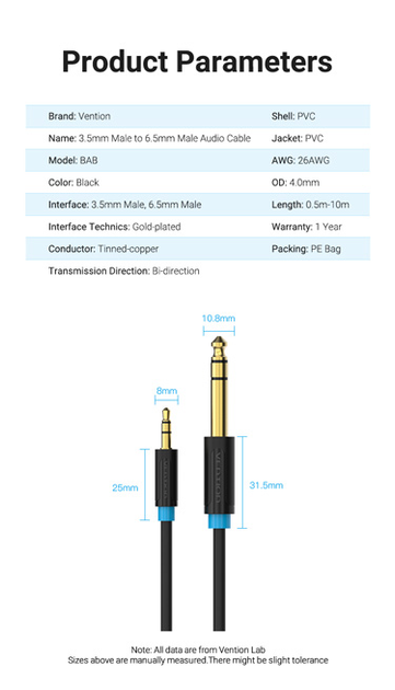 BABBH Кабель 3.5mm TRS Male to 6.35mm Male Audio Cable 2M Black